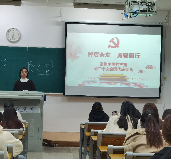 李梦蝶辅导员在会上进行三个方面的辅导:一是学习讲话,把握方向。二是回顾历史,砥砺奋进。通过多媒体的形式带领同学们回顾了党的十八大以来党和国家事业发生的历史性变革和取得的历史性成就,并教育引导他们争做有理想、有能力、有担当,实践、实用、实干的铁杆外院人,勇于担当、从严从实、久久为功、善作善成。三是分享感悟,凝聚力量。从了解的人和身边的事出发,从报告中提到的与青年、教育、创新等相关的阐述中分享自己的感悟,引导同学们讨论党的二十大报告给自己带来的收获,将同学们的个人发展与国家需要结合起来,把个人理想融入到中华民族伟大复兴的历史进程中。