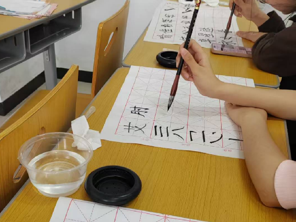 毛笔字练习现场,同学们研墨铺纸、悬腕临摹,深耕笔法、字法与章法,在笔墨韵味中沉淀心性,在慢练细磨中提升专注,实现练字与修心同步提升。