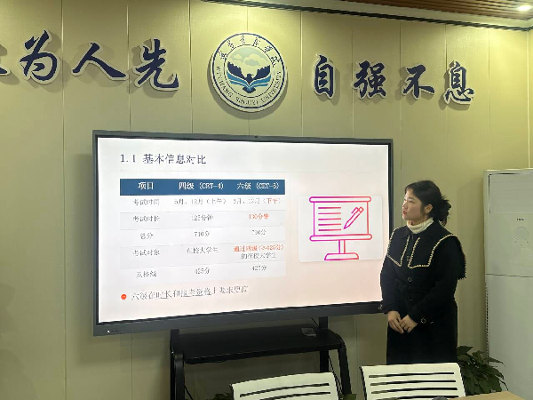 讲座伊始,徐庆霄以“知己知彼,百战不殆”为切入点,带领同学们解析六级考试全景,通过四级与六级的多维度对比,明确六级考试的核心定位与考查要求。同时,她详细拆解了写作、听力、阅读、翻译四大题型的四六级差异,帮助同学们系统掌握六级考试的重点与难点。